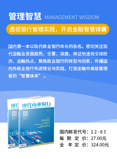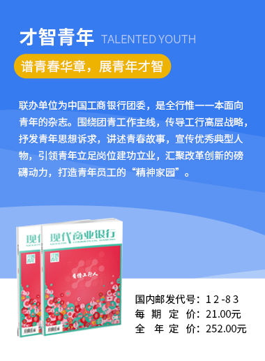杂志创刊于1986年,原名《金融学刊》,1999年更名为《现代商业银行》,主管单位为中国工商银行股份有限公司,由国家新闻出版署批准,国内外公开发行,荣获“中国最美期刊”,收录于CNKI中国知网。自创刊以来,杂志不断提高办刊质量,陆续发展为目前的一刊三版《管理智慧》《才智青年》《财富生活》,分别面向金融中高层管理者、金融青年、金融客户。金融是国家重要的核心竞争力,《现代商业银行》紧跟时代的脚步,以专业的视角、开放的视野、优质的内容,为读者提供有价值的资讯参考。立足新发展阶段,《现代商业银行》将传统媒体与新媒体结合,发挥融媒体传播效应,彰显新时代媒体的责任与担当,致力于服务工行发展战略、服务读者深度金融资讯需求、服务员工成长成才,进一步做好定位,突出办刊特色,讲好金融故事、传递好经济声音,打造以原创为核心的影响力矩阵,服务经济社会高质量发展。